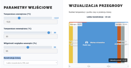 Narzędzie do analizy ryzyka kondensacji pary wodnej w przegrodach budowlanych na podstawie temperatury powietrza i wilgotności względnej.